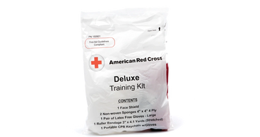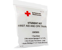 Includes 1 training face shield, 2 4x4 Gauze Pads, 1 Pair Large Latex Free Gloves, 1 3" Roller Bandage