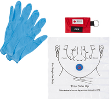 Includes 1 training face Shield, 2 4x4 gauze pads, 1 Pair of Latex Free Gloves, 1 3" Roller Bandage, 1 Portable CPR Keychain w/ Gloves